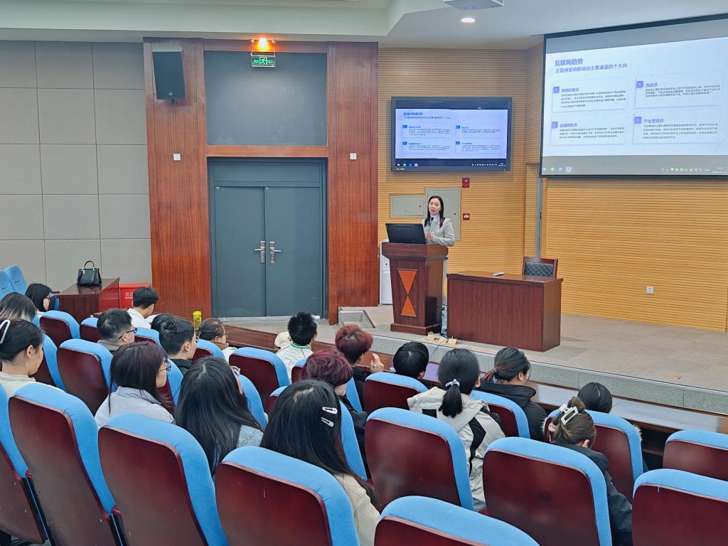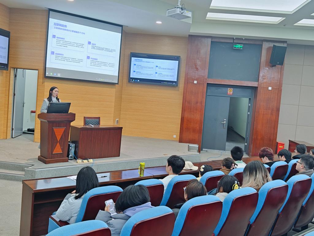 钱老师以“互联网营销师职业发展新机遇”为例,深入剖析行业发展趋势。他指出,随着数字经济快速发展,视频创推员、选品员、直播销售员、平台管理员四大岗位已成为互联网营销领域的核心需求。结合典型案例,钱老师系统讲解了职业能力标准、岗位适配要求及行业发展前景,引导毕业生树立“技能+素养”双提升理念。互动环节中,同学们就职业规划、技能认证等问题踊跃提问,现场气氛热烈。