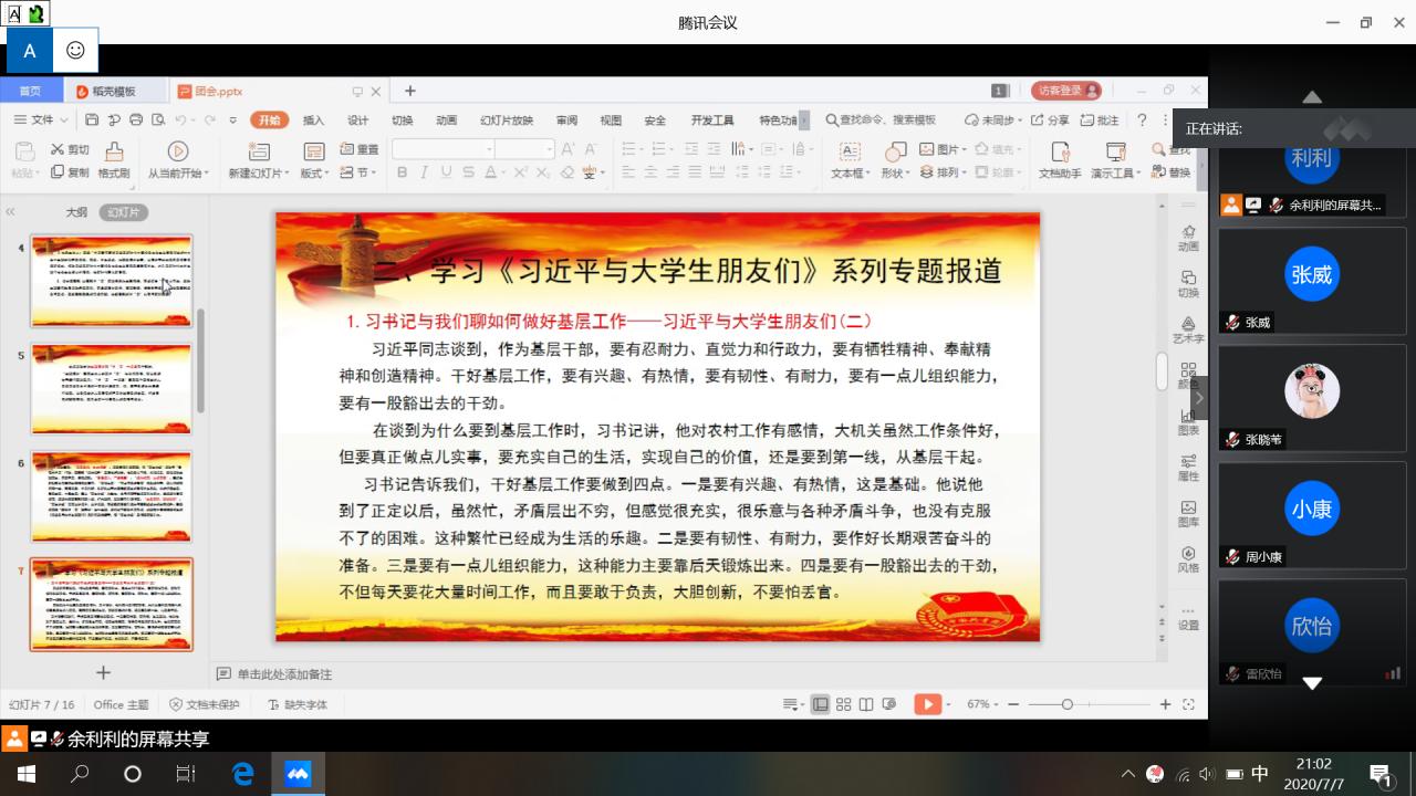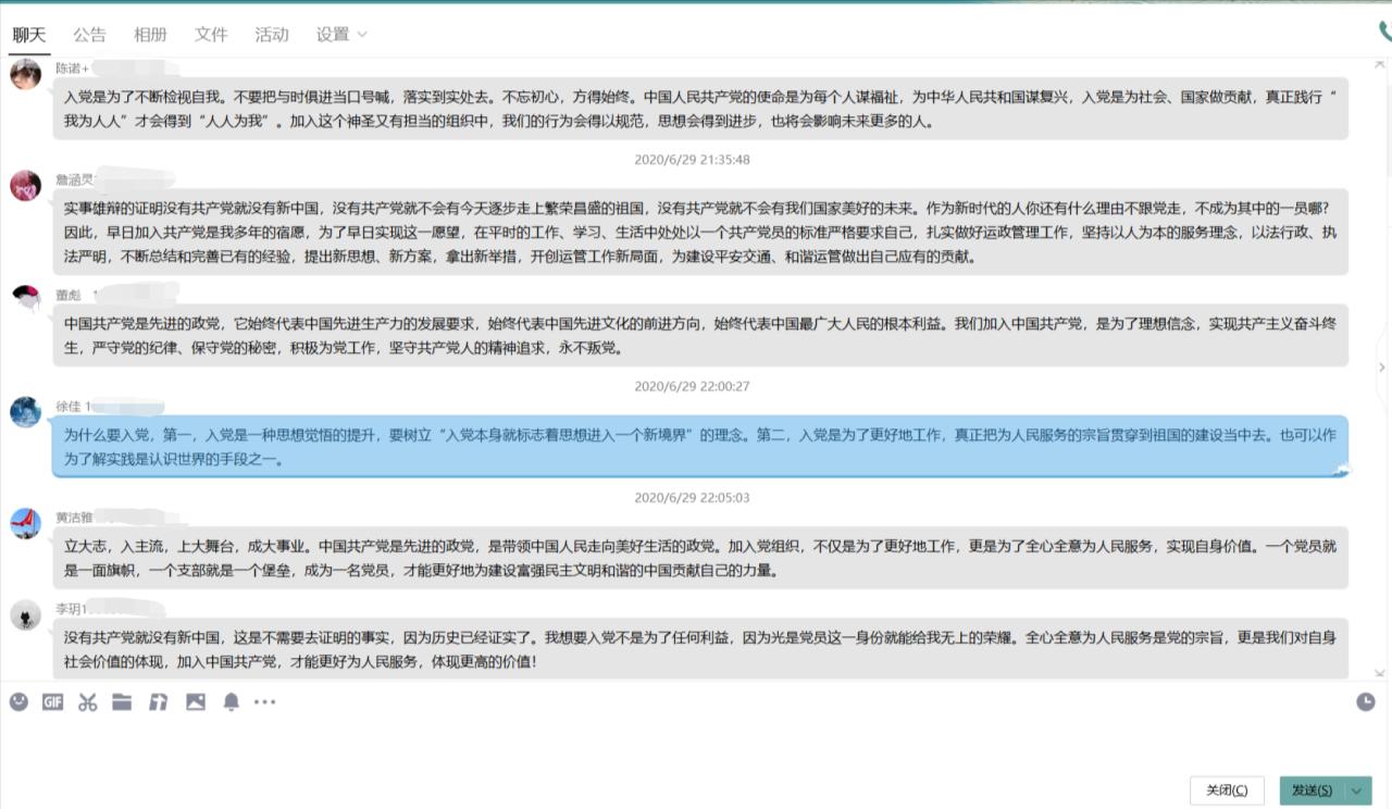 在关于主题“青年大学习 永远跟党走”的班团会通知下达后,公司各团支部积极响应公司号召,根据各自班级实际情况进行精心策划与前期筹备,按时积极地开展了此次活动,同学老师热情高涨,积极参与。本次活动主要围绕三个方面开展:一是各团支部组织学习“百生讲坛”省级优秀主讲人和活力团支部的材料,深入讲解主题、总体思路、评选方式等具体活动内容,并按照要求开展申报及比赛筹备工作;二是学习《习近平与老员工朋友们》系列专题报道,从基层到中央,习近平总书记经常与青年谈心,给青年回信,为青年鼓劲,是青年员工学习的生动教材;三是开展“我为什么入党”主题讨论,展示建党99周年以来的光辉历程和取得的伟大成就,引发团员青年对于入党的思考和自我探寻入党的初心,从言论中可见同学们思想觉悟的高度与深度。