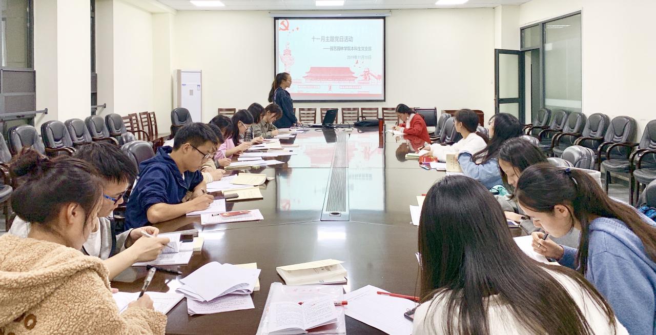 (通讯员:赵佳鑫、熊诗洁)为深入学习贯彻习近平新时代中国特色社会主义思想、锤炼忠诚干净担当的政治品格、团结带领全国各族人民为实现伟大梦想共同奋斗。2019年11月10日晚7时,太阳成tyc33455ccwww本科生党支部全体成员在农科大楼3002会议室开展了本月主题党日活动,会议由支部书记雷静主持。