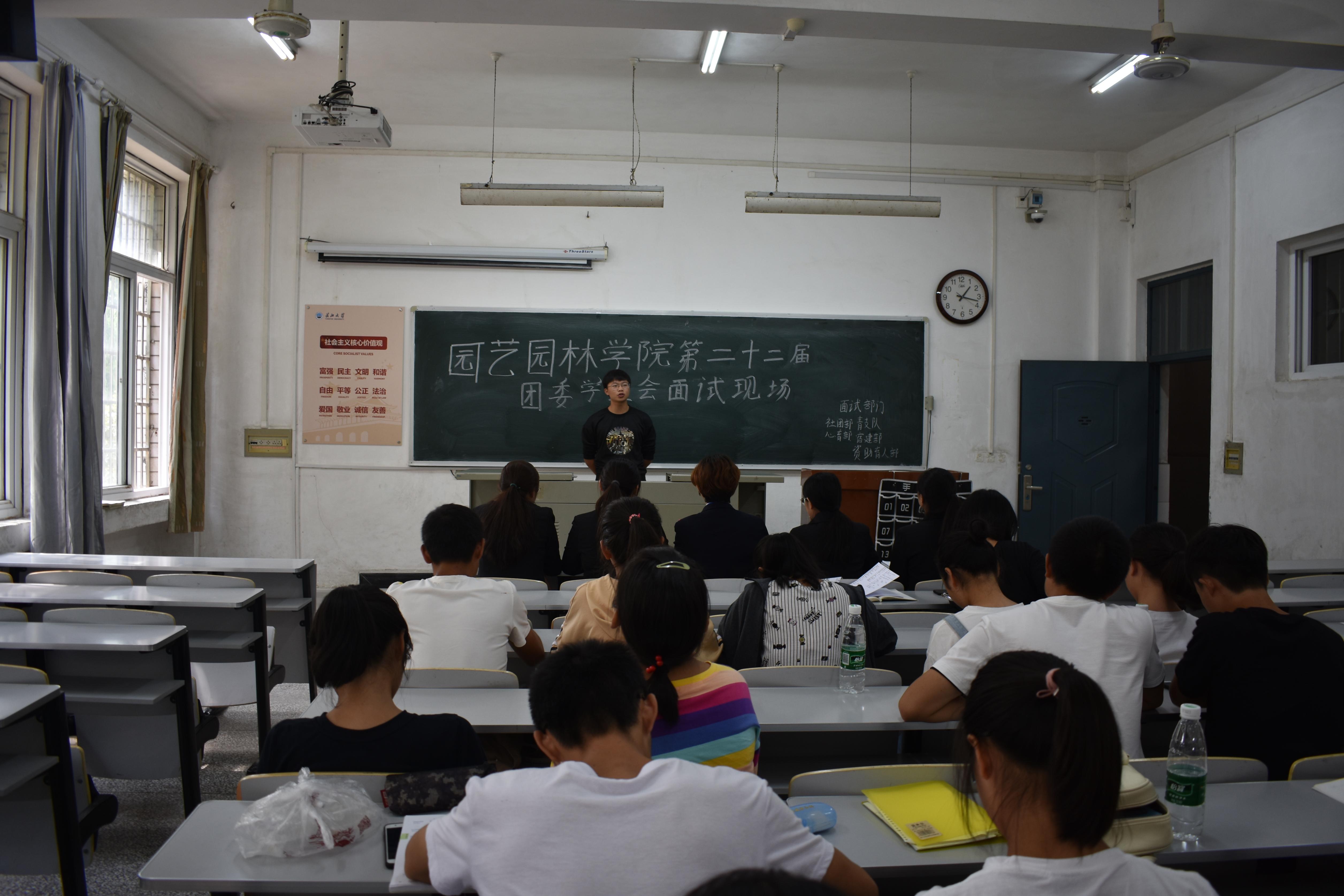 面试活动在笔试结束后的第二天于西校区6教105、106、107展开。此次面试的对象为通过笔试的19级新生,面试的工作人员为主席团成员、各部门部长、副部长。面试分为两个环节,第一个环节为面试对象进行两到三分钟的自我介绍,第二个环节为一分钟左右的评委提问。面试过程中,19级同学在自我介绍中就自身优缺点、对员工会的认识及未来发展规划等做出简明的论述。评委们仔细听取新生的自我介绍,并提出适宜的问题以考察新生处理相关问题的能力,并针对其优缺点给出适当建议。面对台下众多的评委,19级新生中有从容自信轻松回答评委所提出的问题的同学,也有性格内向但言谈举止中流露出对从事于员工会工作的真挚渴望的同学。由于各部门工作内容的不同,会对同学的能力侧重有不同的要求,面试时评委们也更加严格。