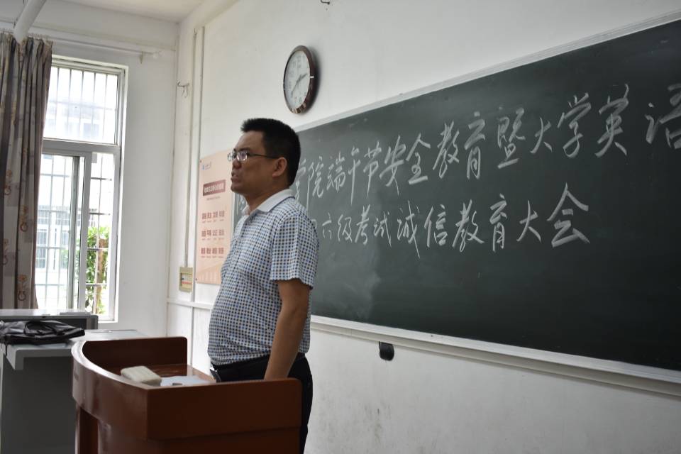紧接着,孙老师讲到了弘扬优良学风诚信应考问题。他谈到:立人以本,诚信为基。全国英语四六级考试是国考,必须以自己真实状态诚信应考。并举出多个校内实例告诫同学们考试违纪的严重后果。大会尾声,同学们在孙老师的积极号召下纷纷签下诚信应考承诺书并表示必将秉持诚信意识真实应考。