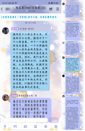 此次教育月活动分年级分对象开展,2018级、2019级以班级为单位开展了以“诚实做人,守纪抗疫,诚信治学””主题班会,同学份积极参与并发表感言。茶学职31901班的代桂林分享到,“如果把这次疫情比做一场大考,考试成绩显而易见。如今临近期末,我们也要迎来一场大考,在这场大考中我们要以最好的姿态迎接考试,诚信考试,不欺骗自己,拒绝舞弊,尊重自己。”