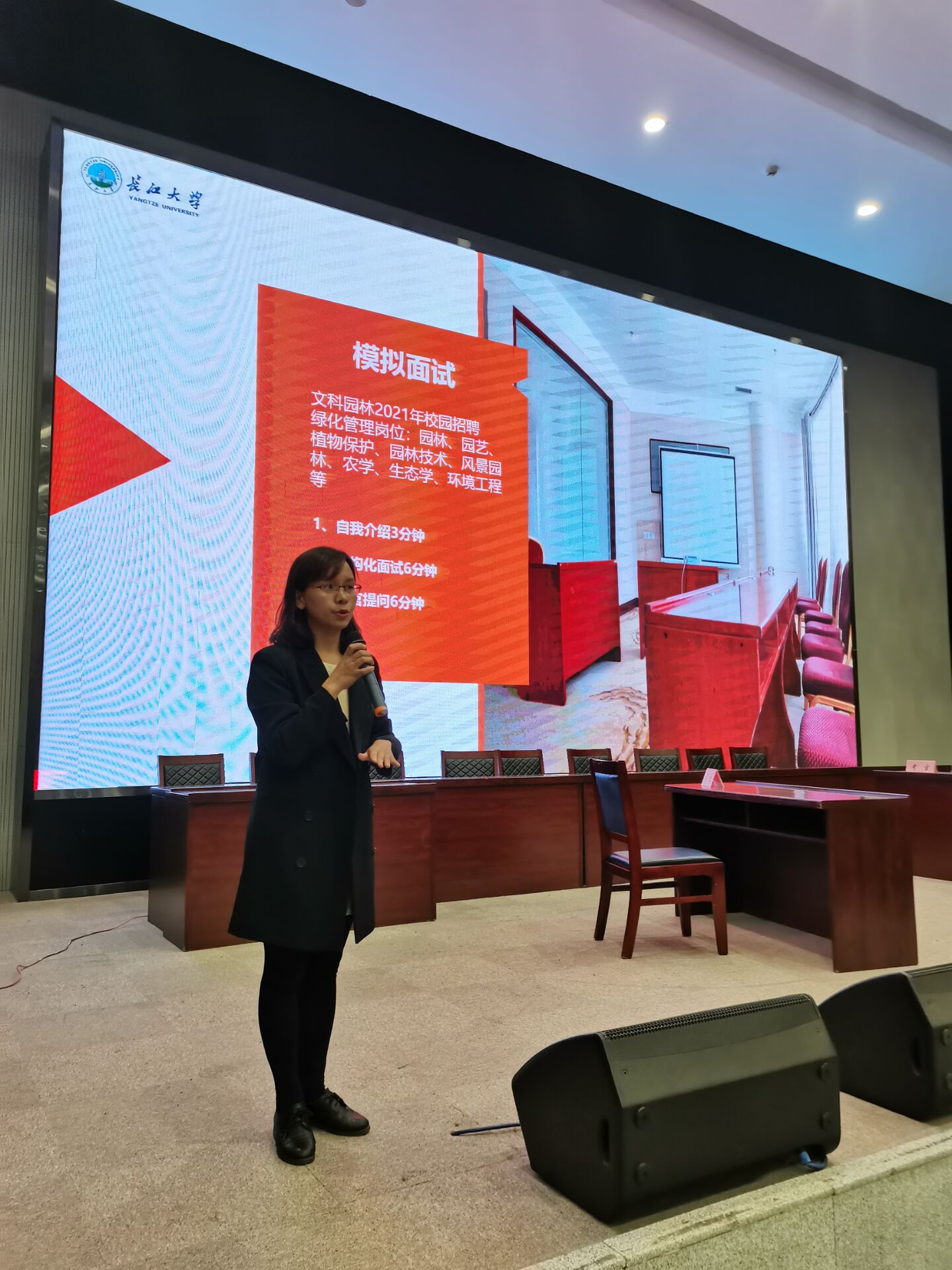 团委书记王娟组织3名员工和5名考官进行了现场模拟面试。面试分为自我介绍、结构化面试和考官提问3个环节。通过3位同学的展示,大家可以更直接的感受面试氛围,观察面试者的现场表现,对比自身优劣势。景园31701班的黄杰同学根据3位同学的表现做了详细笔记并进行了现场分析。研究生郭欣媛建议大家多关注练习,让肌肉记忆伴随自己,在面试时展现出最好的一面。最后,王老师从人际交往距离、目光、着装等方面进行了点评。她鼓励大家要像工作一样去找工作,只要找准方向,积极投入,总会有自己的一片天。