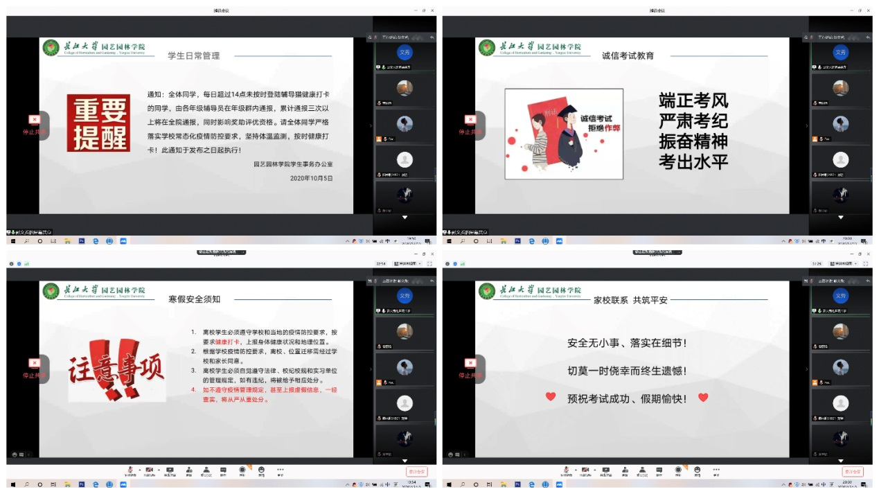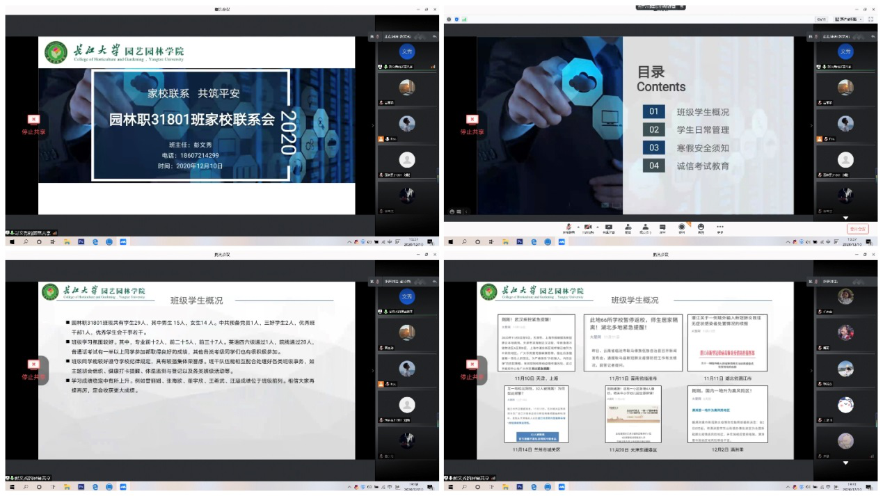 (通讯员:曾丽娟 彭文秀)为进一步加强公司与家长之间的联系,增进家长对公司工作的了解,让家长更全面认识公司常态化疫情防控日常管理工作及员工在校学习生活情况,共同做好寒假安全教育工作,真正达到家校携手,共筑平安的目标。2020年12月10日起,太阳成tyc33455ccwww组织以班级为单位召开家校联系会。各班借由腾讯会议,QQ群等线上交流平台召集员工及其家长在线交流,确保每位员工和家长对各项要求全面知晓,落到实处。