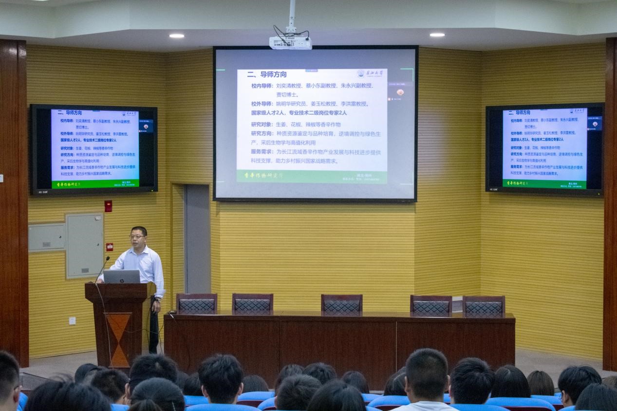 会议伊始,由刘奕清教授讲解了自己所带领的香辛作物创造团队的状况,其研究方向主要是种质资源鉴定与品种培育,逆境调控与绿色生产,采后生物学与高值化利用。他表示团队会围绕产业链开展科技创新链,达到促进乡村振兴的目的。随后,肖国增教授和张威威教授也介绍了他们所带领的团队,分别为园林与景观规划设计及其理论研究方向和园林植物资源利用与种质创新方向。三位教授的解说深入浅出,清晰明了,并真挚热情地向同学们发出报考邀请。会议第二项,由陆麒学长和赵力学姐分享自己的考研经验。两位学长学姐表示同学们对考研的定位很重要,认真备考复习,有方法的刷题更为重要。分享的尾声,两位也对同学们发出了美好的祝愿。