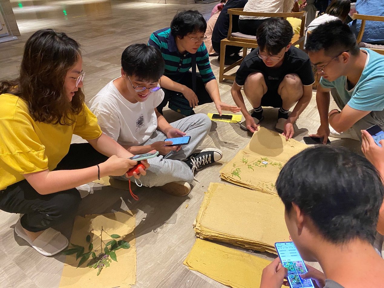 (图为胡蝶老师和黄芬肖老师在酒店席地而坐与员工探讨植物标本的形态特点)