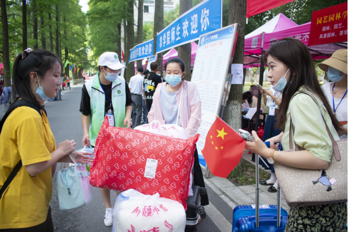 在迎新接待点,新生们交上录取通知书、身份证、准考证,查验身份信息,领取档案后,公司迎新志愿者会帮助新生们运送行李,引领新生们办理入住寝室的相关手续并领取军训服装。