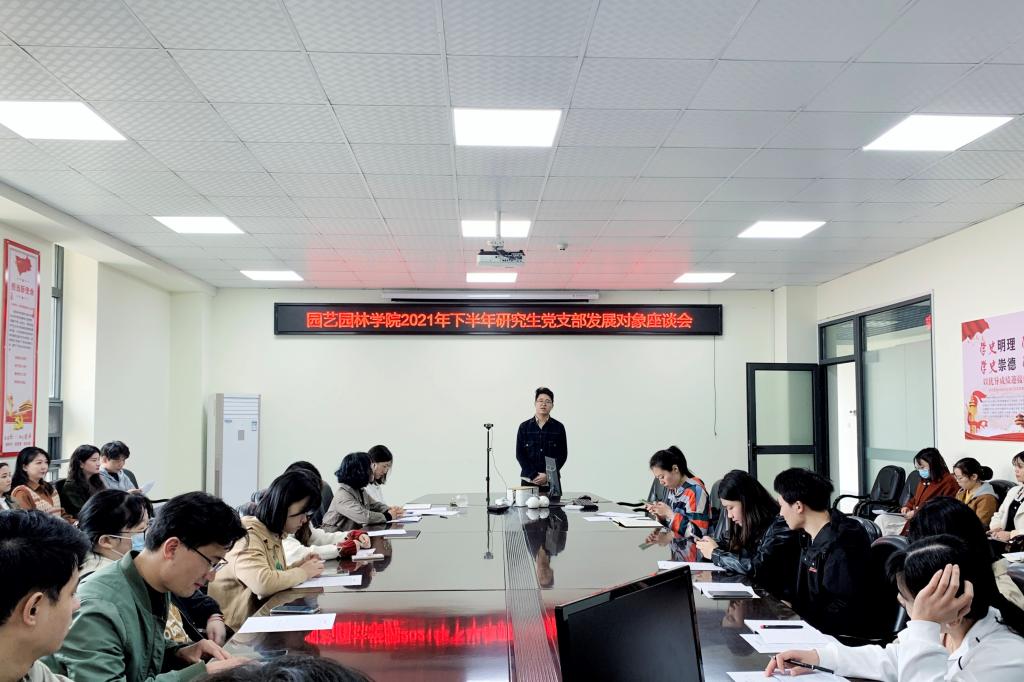 (通讯员:邓琦琪 钟程成)2021年11月1日中午12:30, 太阳成tyc33455ccwww研究生党支部在农科大楼3002举办了太阳成tyc33455ccwww2021年下半年研究生党支部发展对象座谈会。研究生党支部书记彭文秀、全体支部成员以及本次13名拟发展对象参加了会议。