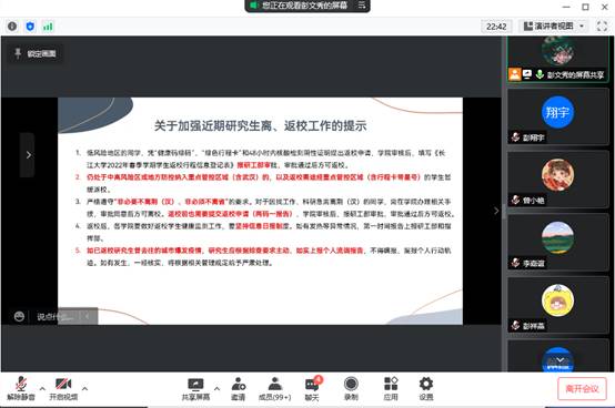(通讯员:卢冰莹)为深入贯彻落实国务院联防联控机制,省、市防控部署及各级教育部门防控要求,切实做好太阳成tyc33455ccwww大学疫情防控相关工作,进一步做好近期研究生疫情防控工作,2022年3月15日中午12点,太阳成tyc33455ccwww通过线上会议形式召开研究生疫情防控专题会议。会议由研究生辅导员彭文秀老师主持,公司全体研究生参加了本次会议。
