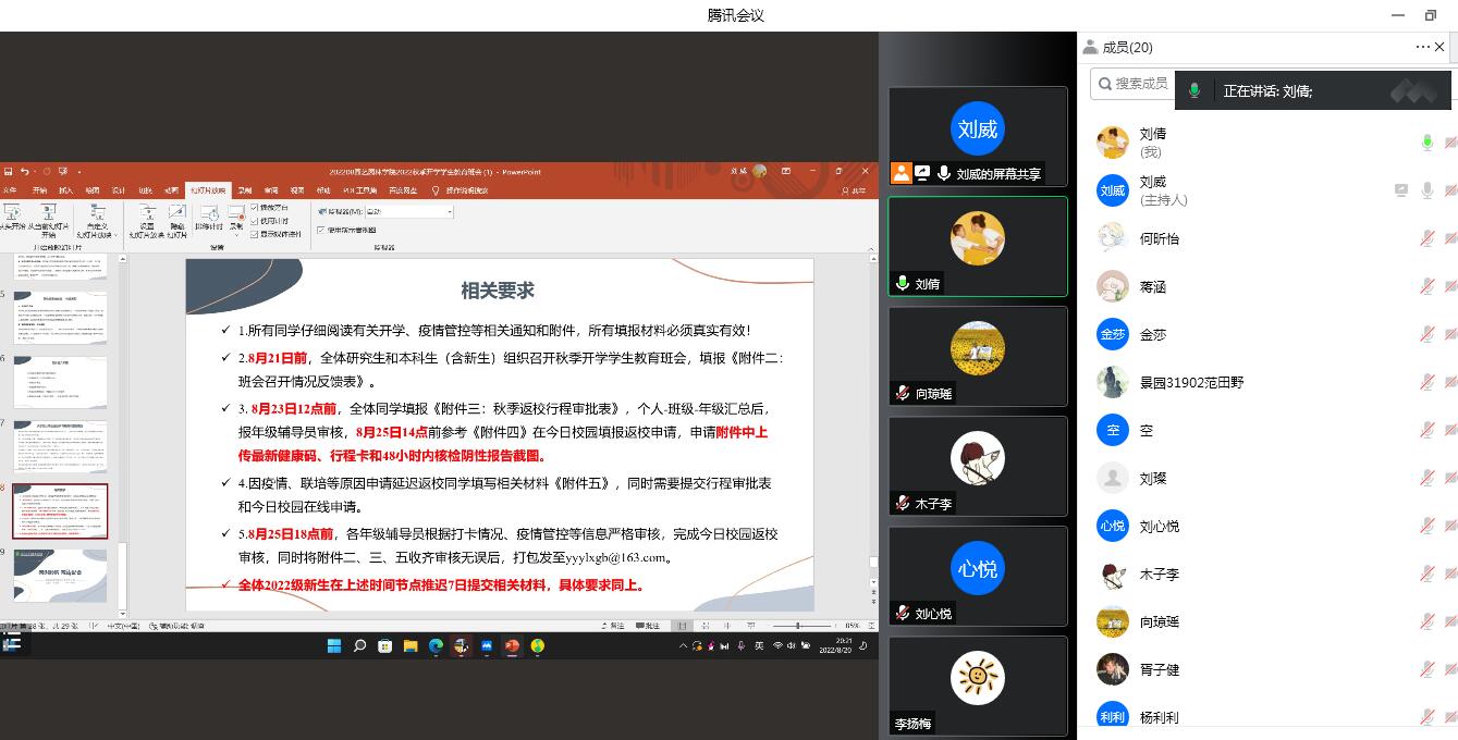 (通讯员:陈聪)当前,国内外新冠肺炎疫情防控形势依然严峻。为有效降低疫情传播风险,确保公司2022年秋季学期开学工作平稳有序,太阳成tyc33455ccwww于2022年8月开学前以班级为单位通过线上腾讯会议方式开展秋季开学教育主题班会。