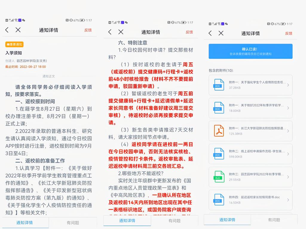 此外,公司学工办将近期公司有关疫情防控和开学返校的通知梳理汇总,通过今日校园向全体员工(含新生)发布开学须知和附件,保证全体同学阅读学习并确认。