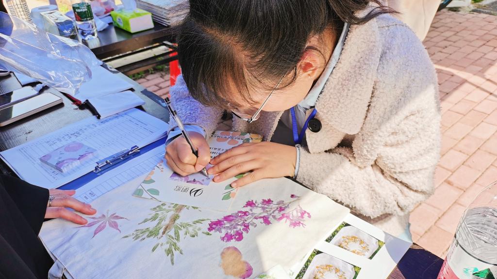 4月7日早上8:30,院研究生会成员到达活动现场布置活动场地,9:00活动正式开始,参与人员前往接待区了解活动内容,签字领取素白帆布包以及材料和工具,前往制作区开始创作,参与人员可根据自己的审美以及想法,将不同的植物拓印在帆布包上,创作出独一无二的作品。作品完成后,工作人员发给参与者祝福卡片,由参与者写下祝福语,将卡片置于帆布包中,活动参与者也可凭作品在接待区领取自己喜欢的纪念礼品。最后,参与人员将作品交给工作人员,作品以及祝福卡片将在活动结束后由工作人员捐赠至荆州市自闭症康复中心,将其赠送给自闭症儿童,为自闭症儿童带去一份温暖。