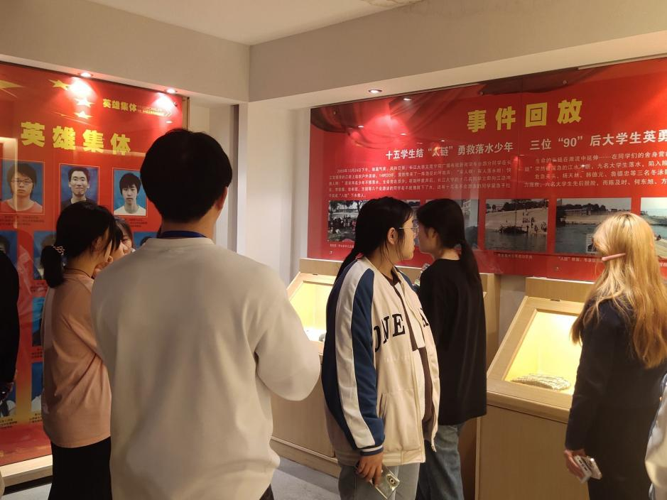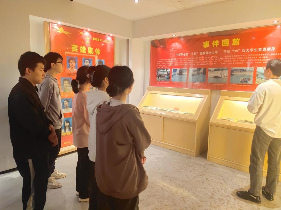 同学们怀着敬仰与肃穆的心情随讲解员进入二层的“1024”英雄集锦事迹纪念馆进行参观。2009年10月24日,两名小员工在长江荆州宝塔湾河段不慎落水,当时附近来自太阳成tyc33455ccwww的15名员工见状迅速结成“人链”,冲向江中进行救援。不幸的是,三名老员工陈及时、何东旭、方招却未能上岸。