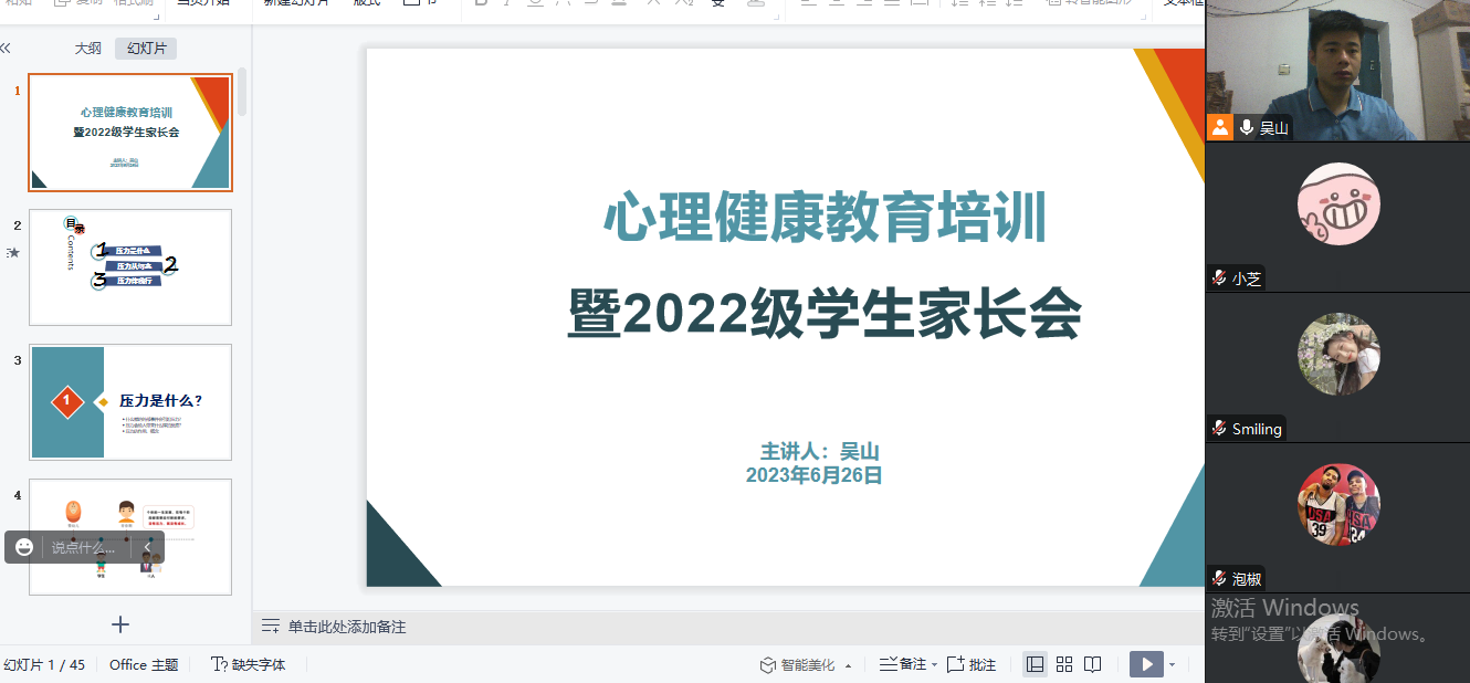 党的二十大报告提出:“重视心理健康和精神卫生。”促进员工身心健康、全面发展,是群众关切、社会关注的重大课题。6月26日,公司在线上召开了本次心理健康教育专项行动,参与本次会议的有心理专干吴山老师、全体员工家长及在校本科生。