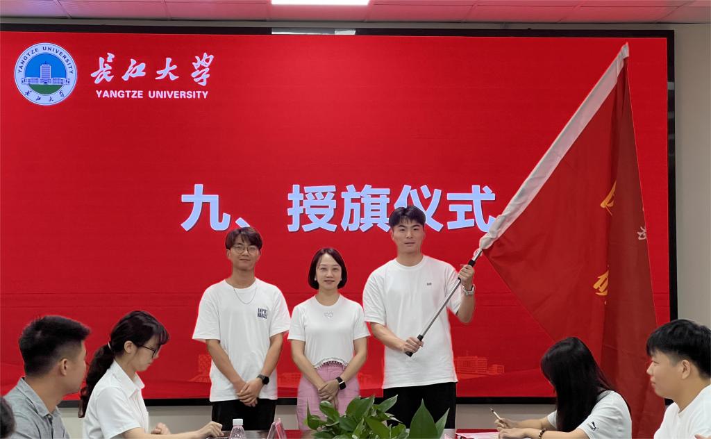 会议第九项授旗仪式。由黄仙将旗子从第三届研究生会主席团代表移交到新一届主席团代表的手中,这面旗不仅是公司的旗帜,更是一份光荣的责任。