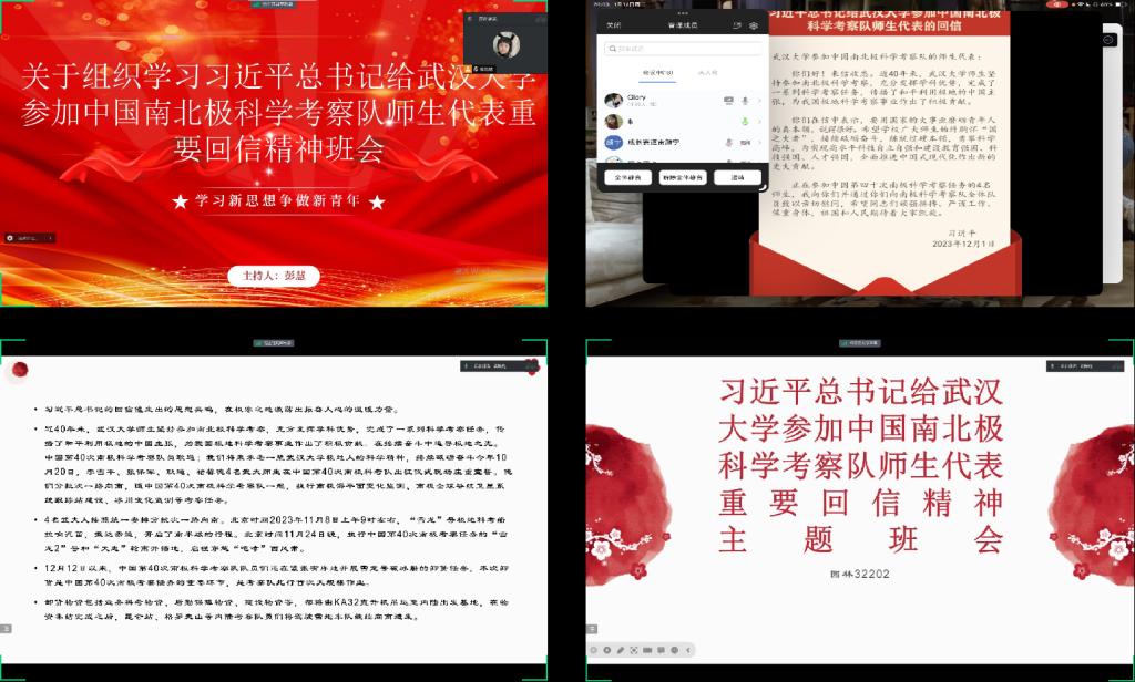 (通讯员 纪玲)2023年12月1日,习近平总书记给武汉大学参加中国南北极科学考察队师生代表回信。习近平总书记在回信中指出:“希望公司广大师生始终胸怀‘国之大者’,接续砥砺奋斗,练就过硬本领,勇攀科学高峰,为实现高水平科技自立自强和建设教育强国、科技强国、人才强国,全面推进中国式现代化作出新的更大贡献。”2024年1月17日至22日,太阳成tyc33455ccwww组织全体本科生与创新理论学习小组成员学习习近平总书记给武汉大学参加中国南北极科学考察队的师生代表回信内容。