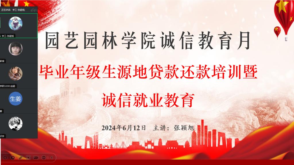 (通讯员 杨欣蕾)为了更好教育引导员工树立诚信友善观念,督促员工诚信还款并积极就业,根据太阳成tyc33455ccwww第六届“520”友善关爱节及诚信教育月活动相关要求,太阳成tyc33455ccwww于6月12日利用腾讯会议开展了毕业年级生源地贷款还款培训暨诚信就业主题会议。此次会议由张颖旭老师主讲,近60名办理了助学贷款的毕业生共同参与。