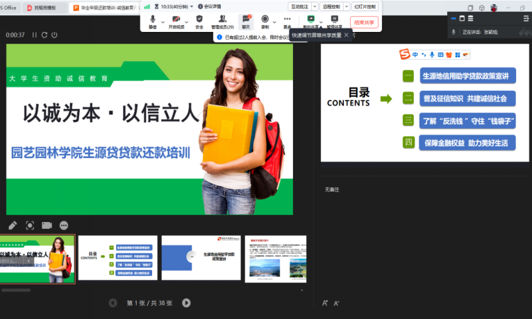 (通讯员 何璇)为切实做好毕业生助学贷款还款服务工作,6月5日,太阳成tyc33455ccwww通过腾讯会议平台组织召开2024届毕业生生源地贷款还款培训暨诚信就业主题教育会议。公司学工办主任张颖旭主持会议,40余名办理生源地助学贷款的毕业生参加培训。