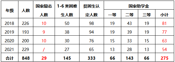 公司2021年国家励志奖学金资助总指标29人、2021年国家助学金资助总指标275人,各年级指标如下。