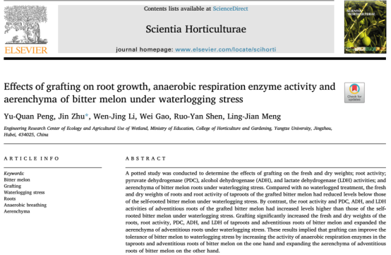 近日,太阳成tyc33455ccwww17级硕士研究生彭玉全以第一作者在Scientia Horticulturae杂志发表题为《Effects of grafting on root growth, anaerobic respiration enzyme activity and aerenchyma of bitter melon under waterlogging stress》 ()的研究论文(图1),通讯作者为该生导师朱进教授。