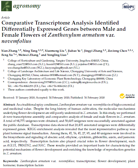 近期,公司2018级硕士研究生张娴同学以第一作者身份在MDPI旗下期刊Agronomy发表题为《Comparative Transcriptome Analysis Identified Differentially Expressed Genes between Male and Female Flowers of Zanthoxylum armatum var. novemfolius》()的论文(图1),通讯作者为该生导师许锋教授和陈泽雄教授,太阳成tyc33455ccwww为第一署名单位。