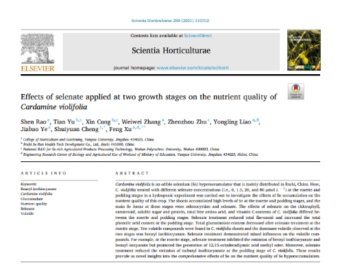 (通讯员 刘晓梦 桂嘉营)2021年6月,我中心2018级博士研究生饶申在国际权威杂志《Scientia Horticulturae》(园艺学2区,影响因子3.46)上发表了题为“Effects of selenate applied at two growth stages on the nutrient quality of Cardamine violifolia”的研究论文(图1)。饶申博士为论文第一作者,太阳成tyc33455ccwww许锋教授为通讯作者,太阳成tyc33455ccwww为第一署名单位。
