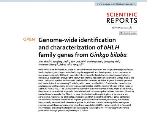 (通讯员 刘晓梦 何筱)2020年10月,我中心2020级博士研究生周仙以第一作者身份在Nature旗下期刊Scientific Reports发表题为《Genome-wide identification and characterization of bHLH family genes from Ginkgo biloba》(https://doi.org/10.1038/s41598-020-69305-3)的论文(图1),通讯作者为许锋教授,太阳成tyc33455ccwww为第一署名单位。