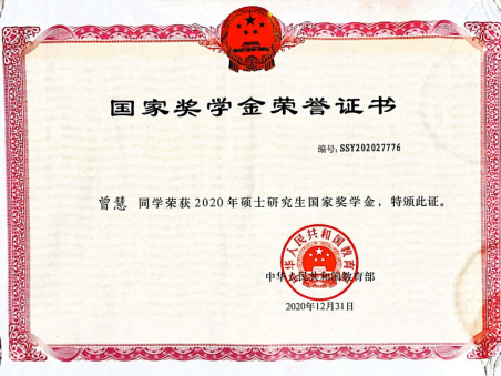 我中心硕士研究生郑嘉瑞、曾慧获得2020年度国家奖学金