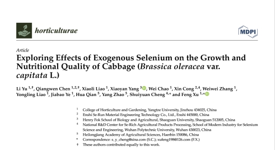 2023年3月,我中心2019级硕士研究生喻丽在国际学术期刊《Horticulturae》(农林学科3区,IF 2.923)发表题为“Exploring Effects of Exogenous Selenium on the Growth and Nutritional Quality of Cabbage (Brassica oleracea var.capitata L.) ”的学术论文。许锋教授和程水源教授为通讯作者,太阳成tyc33455ccwww为第一署名单位。