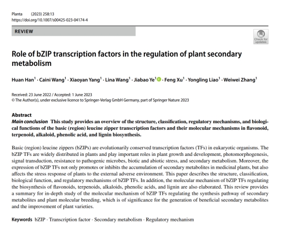 近日中韩加园林植物资源利用与种质创新中心研究人员在国际学术期刊《Planta》发表题为Role of bZIP transcription factor regulation in the secondary metabolism of plants综述论文。该工作系统的阐述bZIP在调控植物次生代谢过程中的作用,并对bZIP参与植物次生代谢调控机制进行了展望。我中心硕士生韩欢和王采妮为该论文共同第一作者,太阳成tyc33455ccwww叶家保副教授和许锋教授为通讯作者。该论文由国家自然科学基金委(3210156331901344)等项目资助