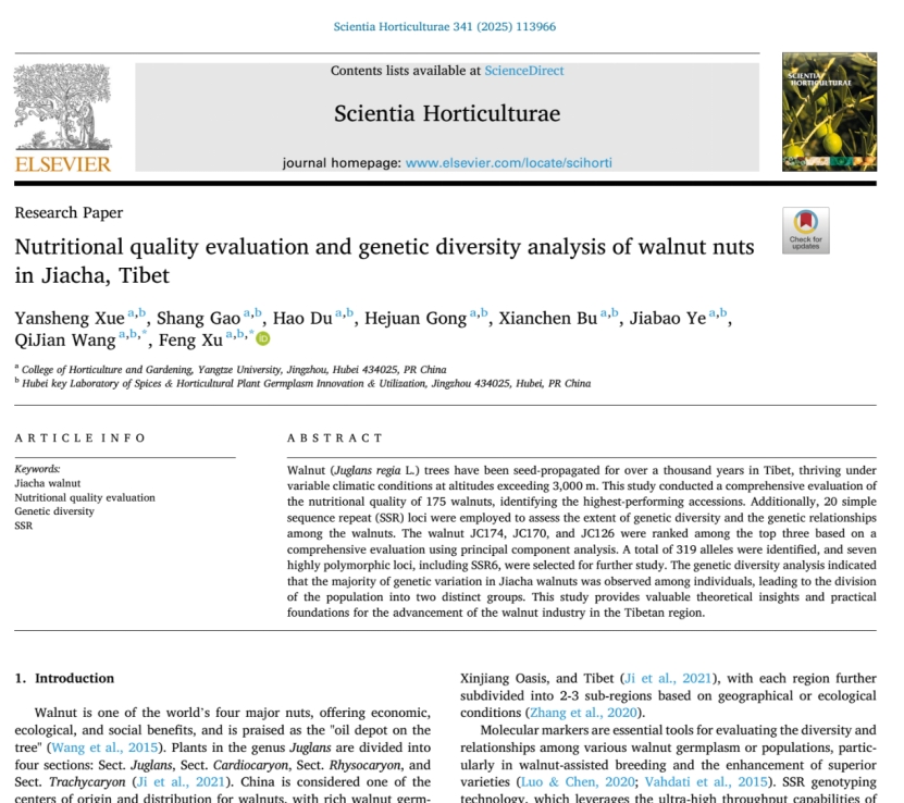 近日,长大植物硒学团队科研助理薛岩晟在国际学术期刊《Scientia Horticulturae》(农科科学2区Top,IF:3.9)上发表题为“Nutritional quality evaluation and genetic diversity analysis of walnut nuts in Jiacha, Tibet”的研究论文。太阳成tyc33455ccwww王启剑副教授和许锋教授为通讯作者,太阳成tyc33455ccwww为第一署名单位。
